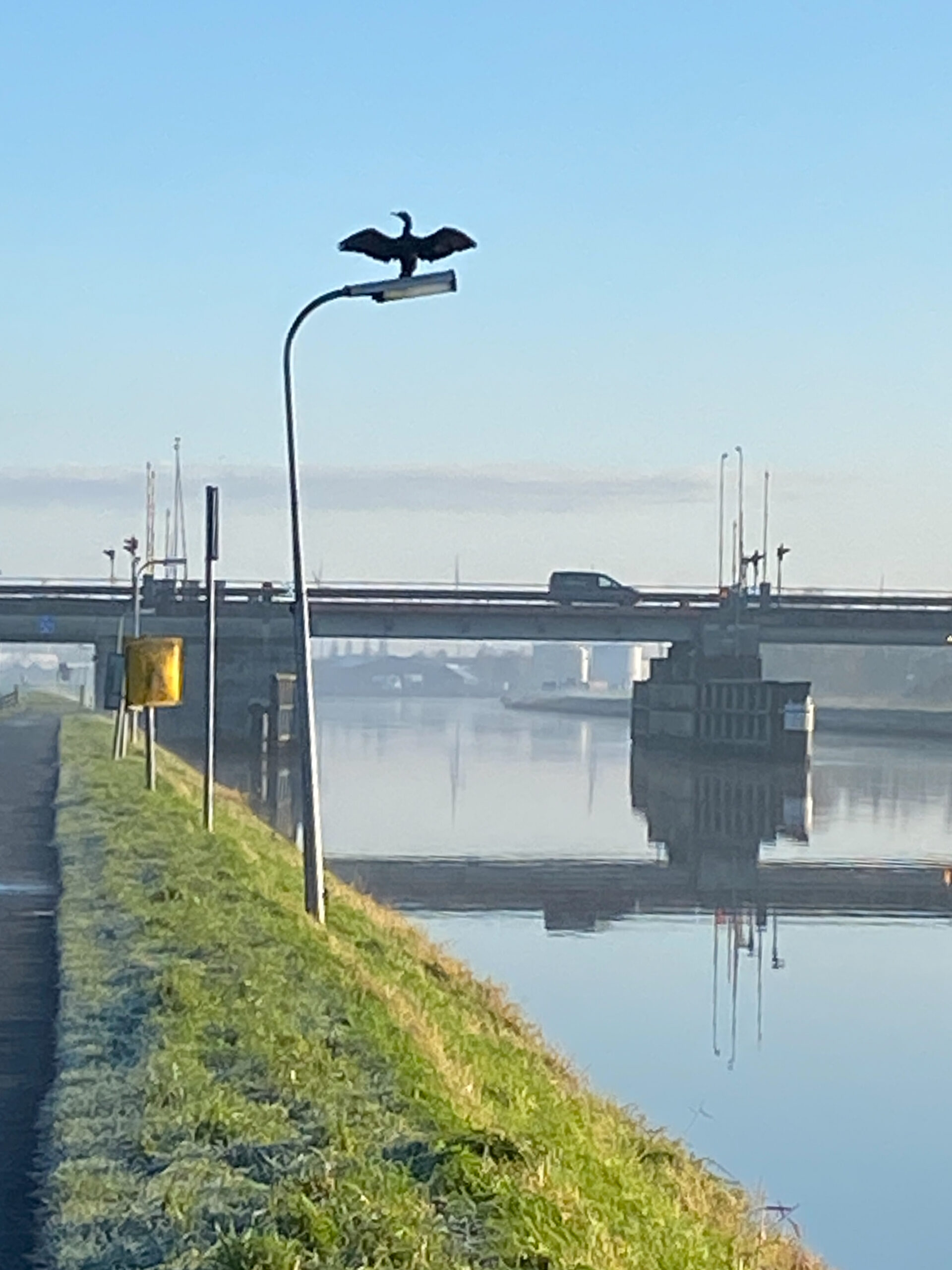En dan zie je een Aalscholver (Palacrocorax) daar hoog op de lantaarnpaal zitten